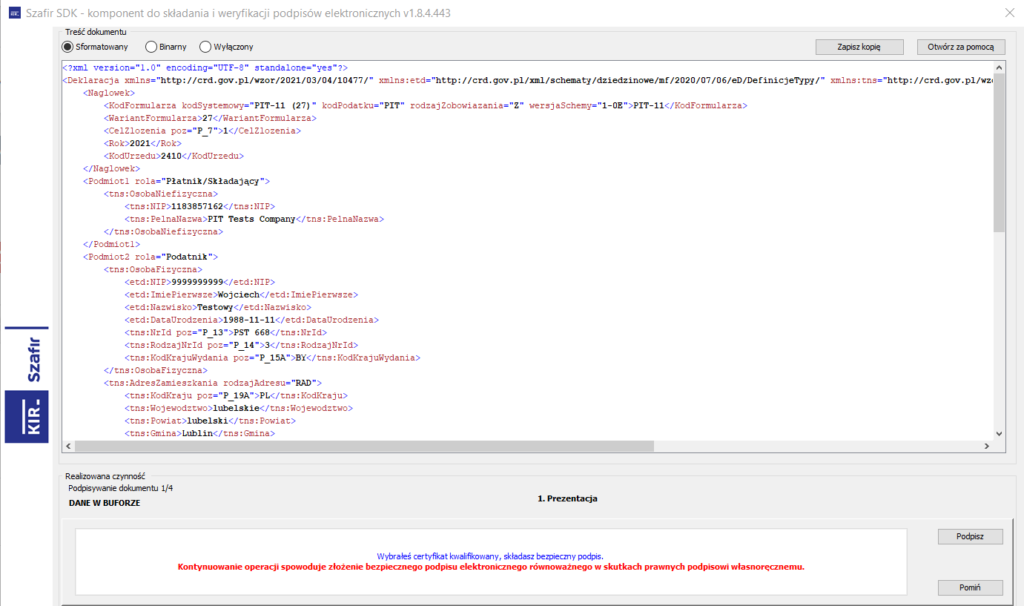 Po kliknięciu przycisku „Podpisz i wyślij” otworzy się okno programu Szafir SDK z podglądem dokumentu. W oknie należy kliknąć przycisk „Podpisz”: