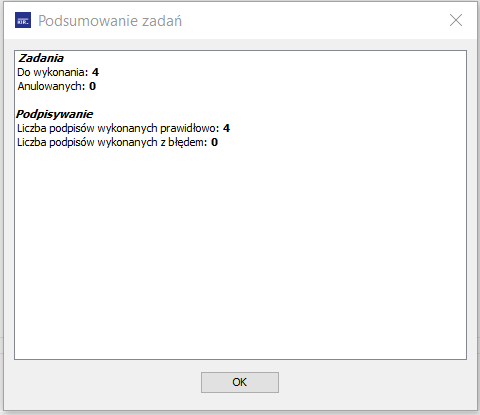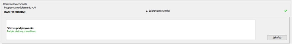 Należy kliknąć „Zakończ”, a w nowym oknie wyświetlone zostaną wyniki podpisów:
