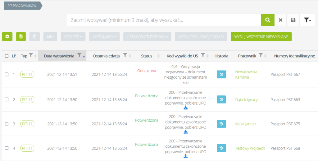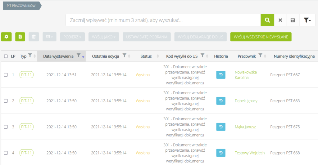 - Rozpoczęliśmy pierwszy etap zmian w module PIT-ów. Obejmuje on proces automatycznego generowania, podpisu i wysyłki PIT-ów do US. W Deklaracje > PIT Pracowników dodane zostały 3 nowe kolumny: Status, Kod wysyłki do US oraz Historia: