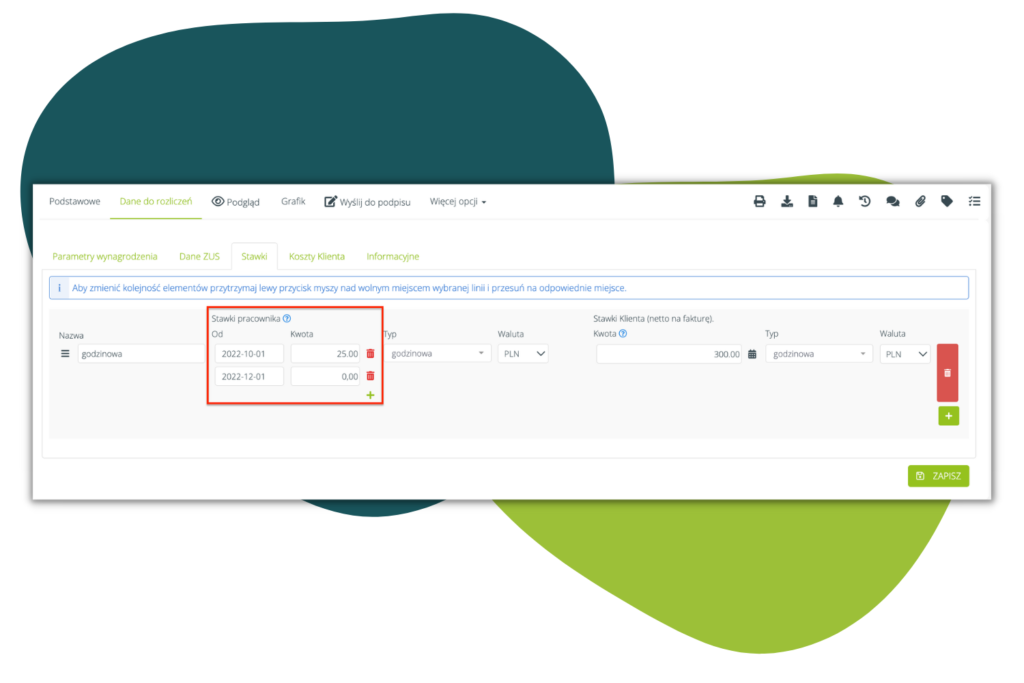 Na przykład: Wprowadzamy stawkę o nazwie „godzinowa”, która obowiązuje od 1 października 2022 i wynosi 25 zł brutto. Chcemy, aby stawka obowiązywała do 30 listopada 2022 roku – wobec czego wprowadzamy nową „datę od” 01 grudnia 2022 – na kwotę 0,00. Wówczas stawka przestanie obowiązywać od 01.12.2022 roku.
