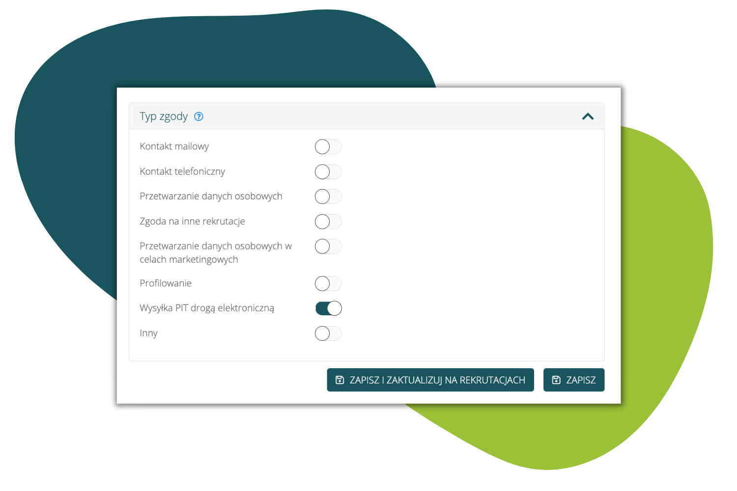 Podczas wysyłki PIT-ów ( Deklaracje > PIT pracowników > Dany PIT > Ikona koperty > Wyślij deklarację do pracownika), automatycznie pokazywana jest zgoda o typie „Wysyłka PIT drogą elektroniczną”, którą edytujemy w Ustawienia > Moduły > Rekrutacje > RODO > Lista zgód).