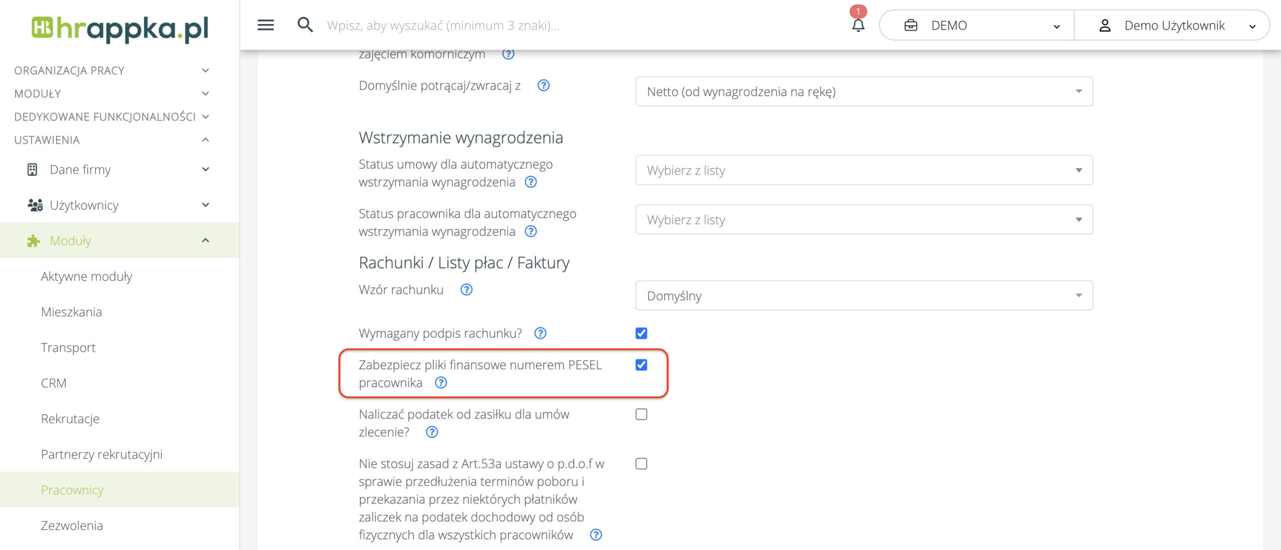 W Ustawienia > Moduły > Pracownicy > Rachunki, listy płac, faktury, pole „Zabezpiecz plik z paskiem wynagrodzeń, numerem PESEL pracownika” zostało zmienione na „Zabezpiecz pliki finansowe numerem PESEL pracownika”.