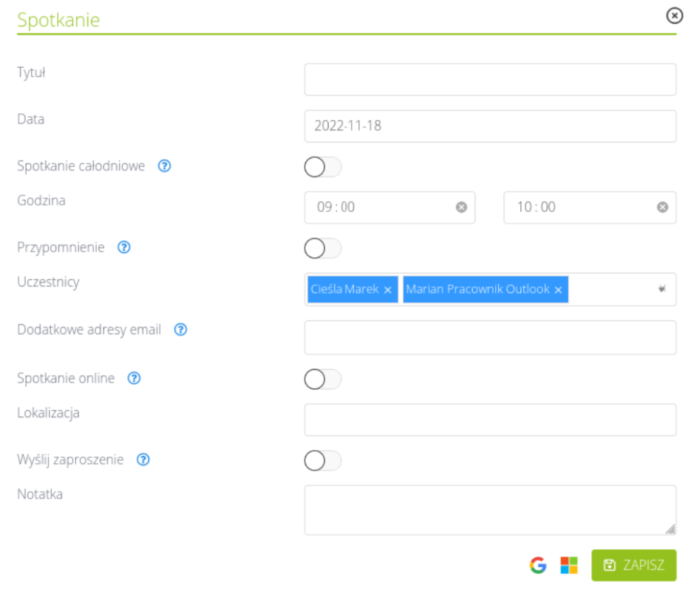 - Jeżeli spotkanie odbywa się online, należy zaznaczyć taką opcję podczas dodawania spotkania. W przypadku integracji z Microsoft, link do spotkania w Outlooku zostanie automatycznie wygenerowany. W przypadku braku integracji dostępna jest opcja samodzielnego wstawienia linku do spotkania.
