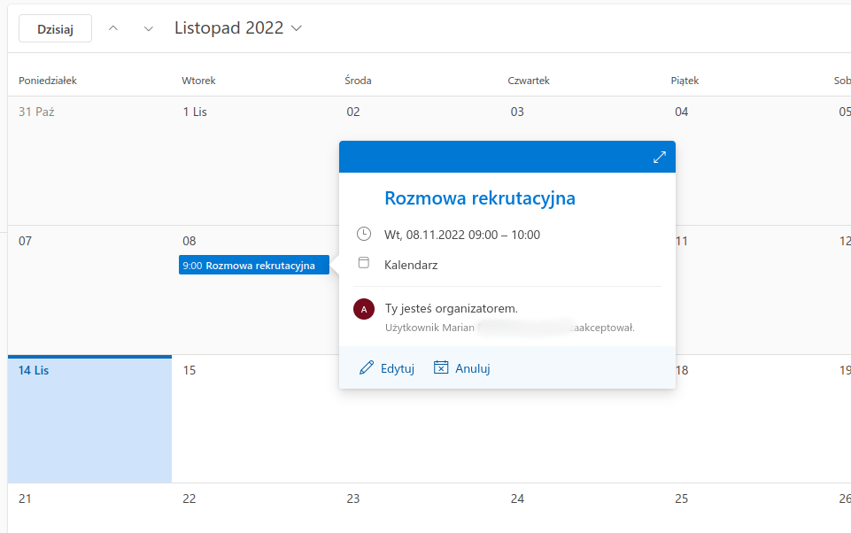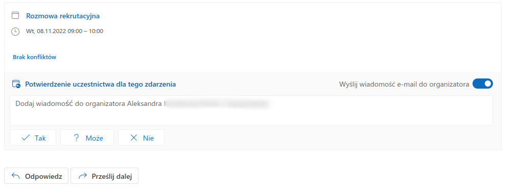 - Po zapisaniu spotkania, zaproszeni uczestnicy dostają powiadomienie na podanego maila. W przypadku aktywnej integracji z Microsoft spotkanie zostanie automatycznie dodane w Outlooku.