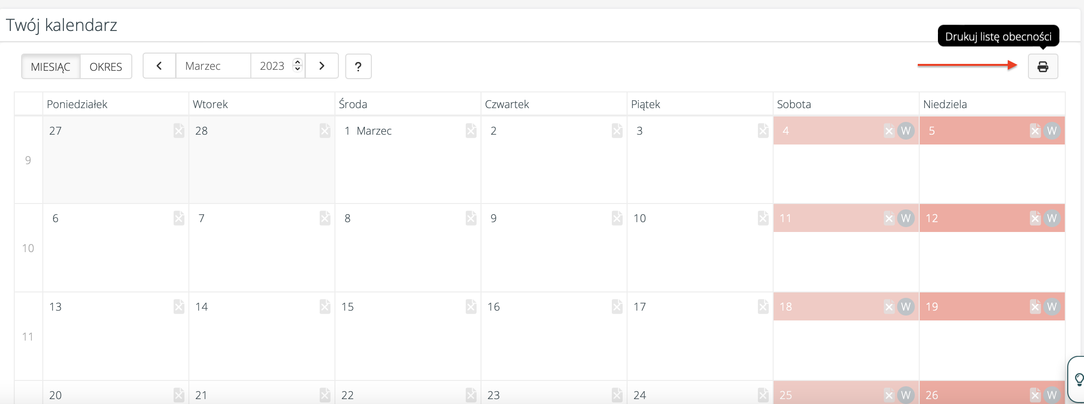 W Portalu Pracownika, na kalendarzu pracy dodana została możliwość wydruku godzin pracy (wydruk obecności z grafiku pracownika):