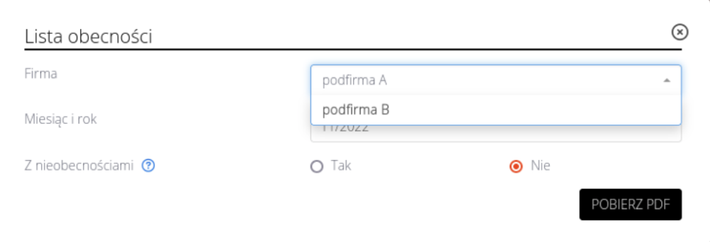 W przypadku, gdy pracownik posiada umowy na więcej, niż jednej firmie, wyświetlone zostaną opcje wyboru firmy, z której wydrukowana ma zostać lista obecności: