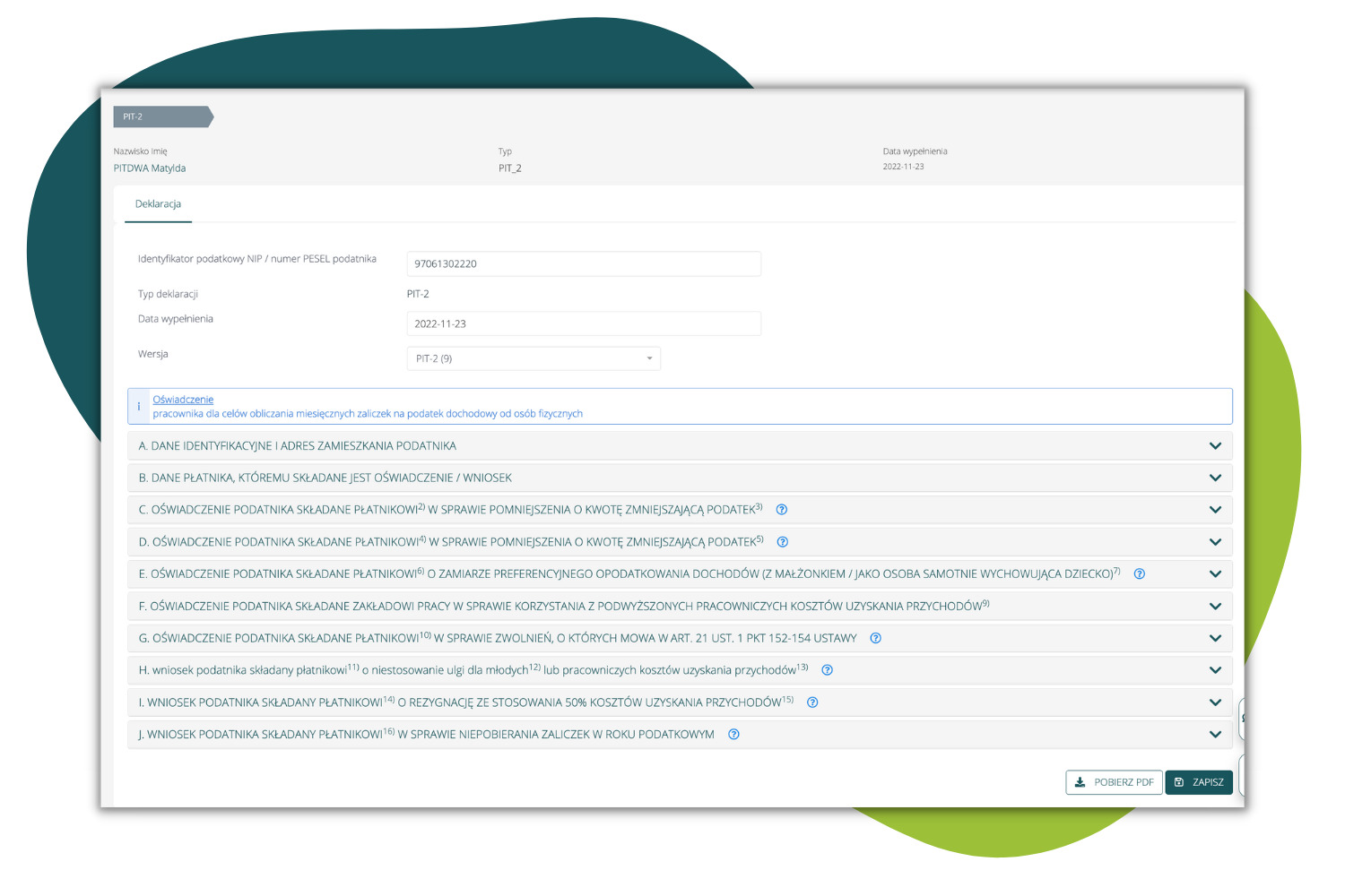 W systemie dodany został nowy wzór PIT-2 za 2022 rok. Informacje uzupełnione w poszczególnych akordeonach przenoszone są automatycznie na wydruk PIT-u-2 (Pracownicy > Lista pracowników > Dany pracownik > Więcej > Deklaracje US oraz Deklaracje > PIT pracowników)