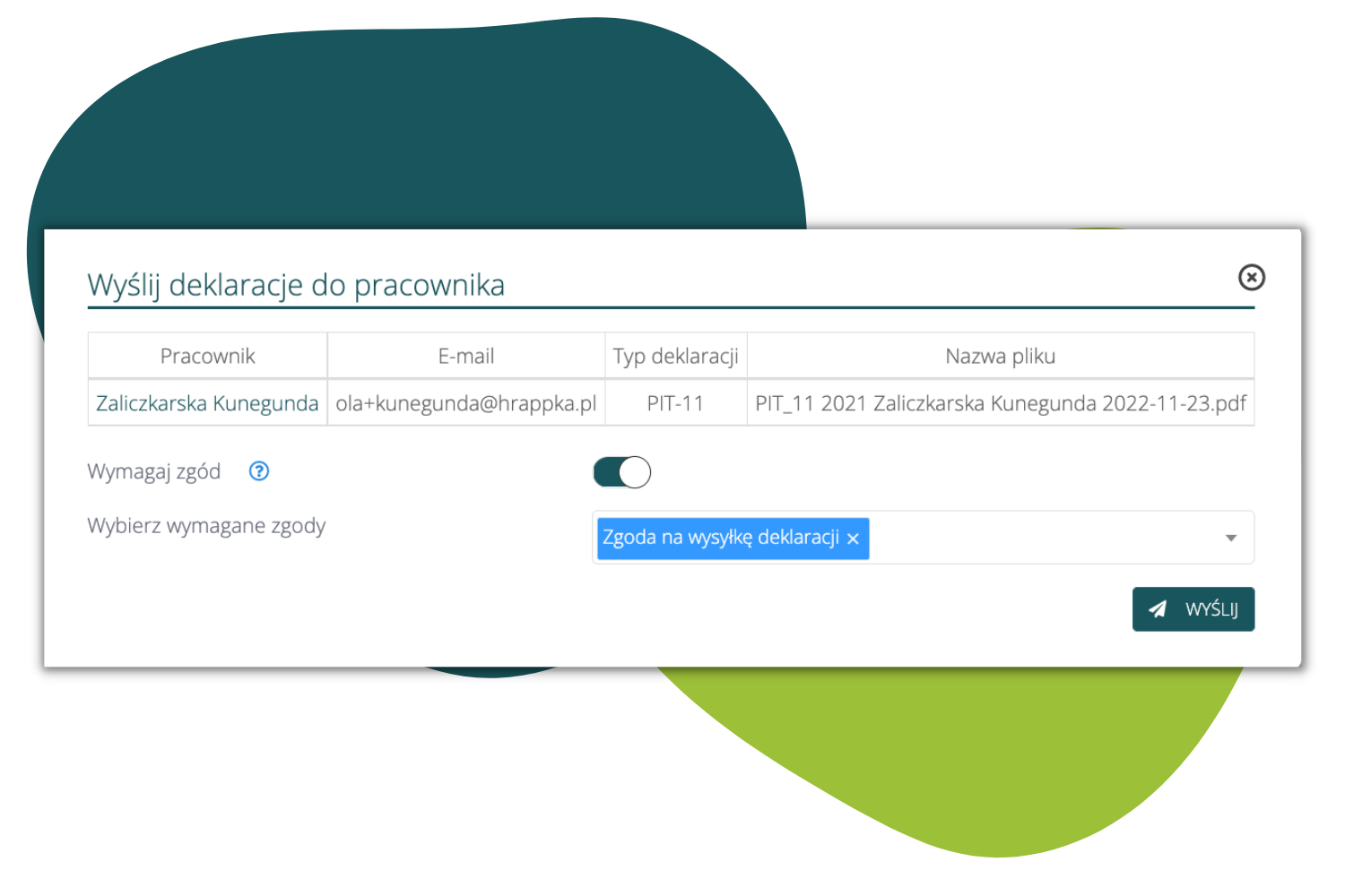 Podczas wysyłki dokumentów do pracownika pojawiła się opcja „Wymagaj zgody”, z możliwością wyboru zgód:
