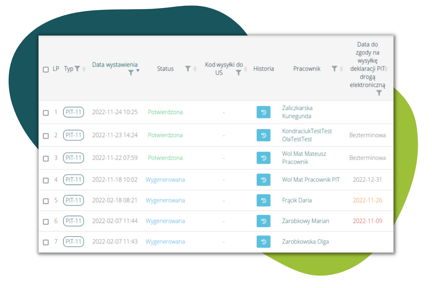 - posiada wiele zgód „Wysyłka PIT drogą elektroniczną”, w kolumnie wyświetlona zostanie wartość z datą najpóźniejszą