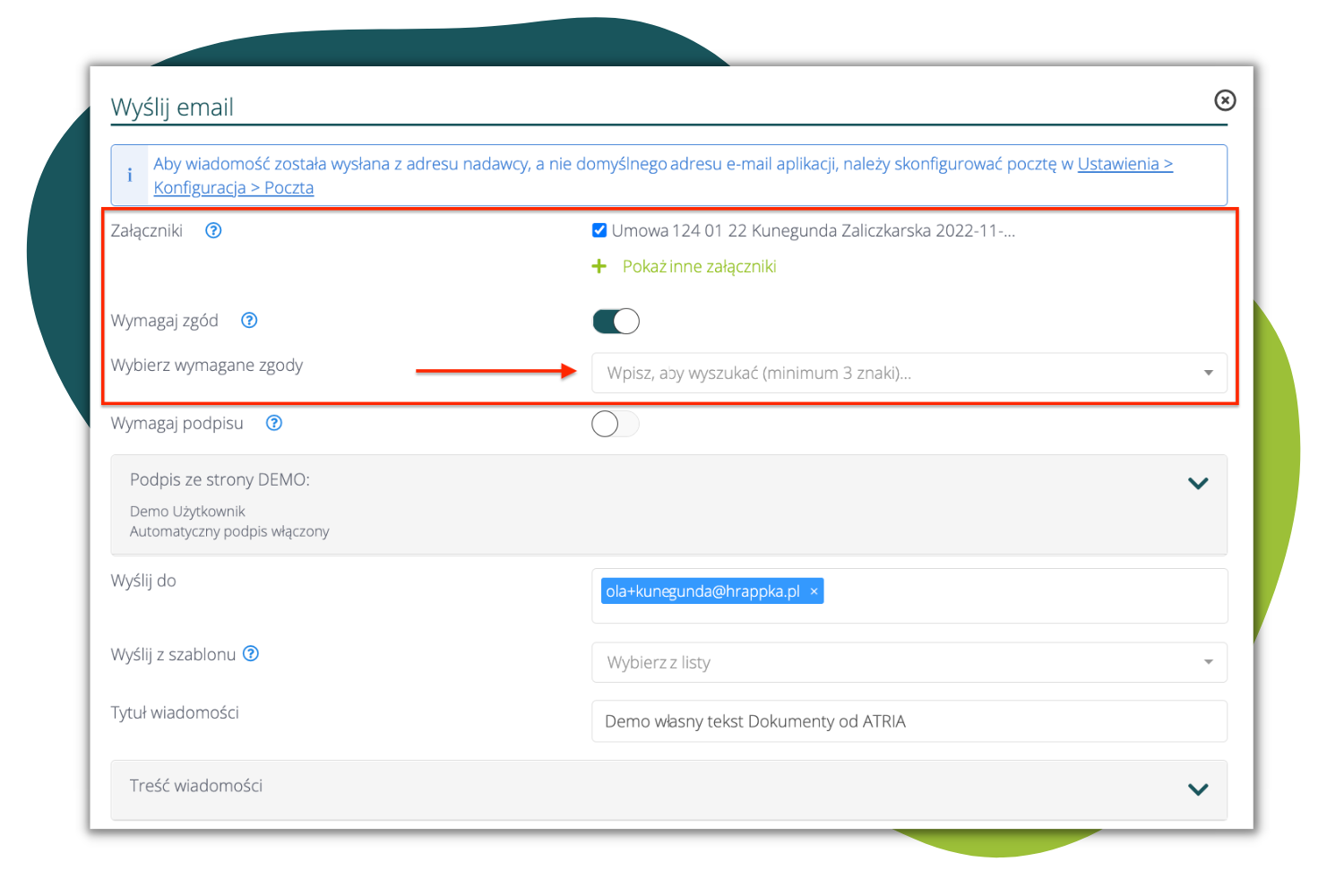Podczas wysyłki zwykłych załączników znajduje się analogiczna opcja pozwalająca na zebranie dowolnych zgód. Pobieranie zgód działa jak powyżej.