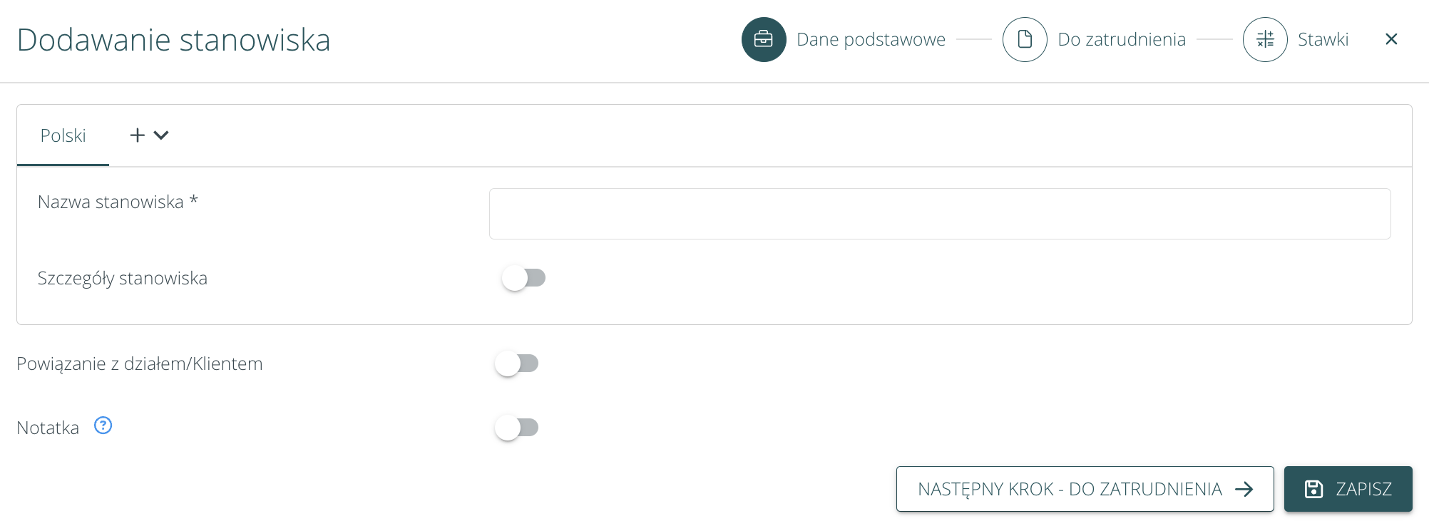 Przebudowaliśmy formularz dodawania/edycji stanowiska. Dzięki temu proces jest uporządkowany i usprawnia proces dodawania / edycji informacji o stanowisku.