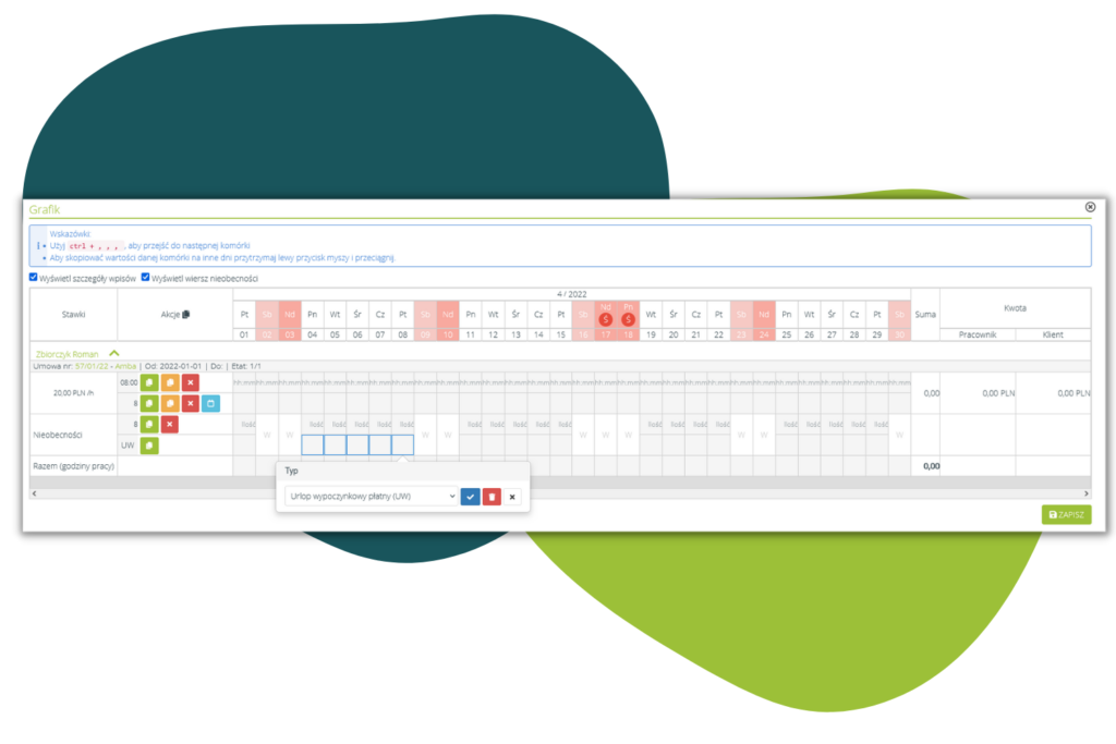 • Własne rodzaje nieobecności i pracy