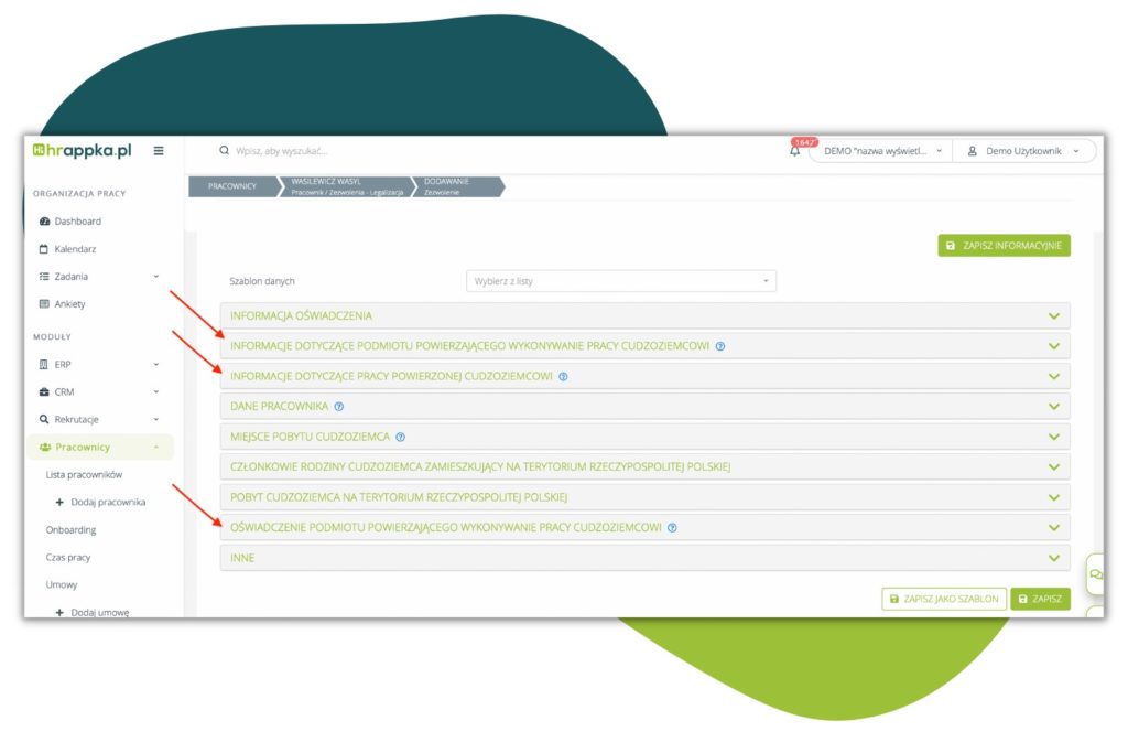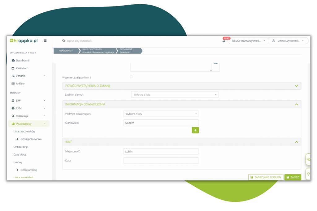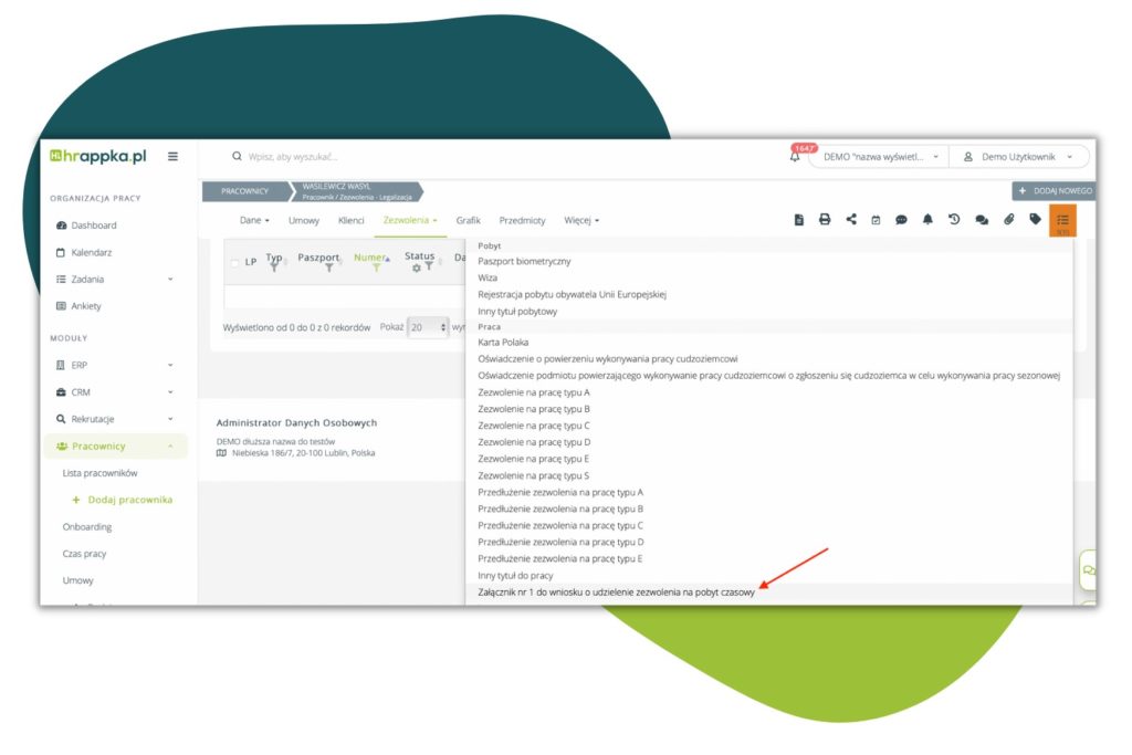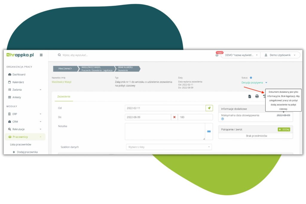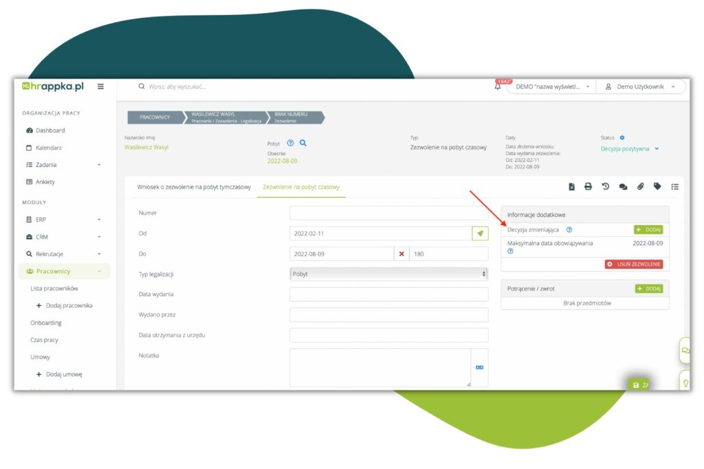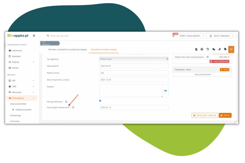 W Pracownicy > Lista pracowników > Dany pracownik > Zezwolenia, na Zezwoleniu na pobyt czasowy, pod polem „decyzja abolicyjna”, dodane zostało pole ” data wysyłki oświadczenia”:
