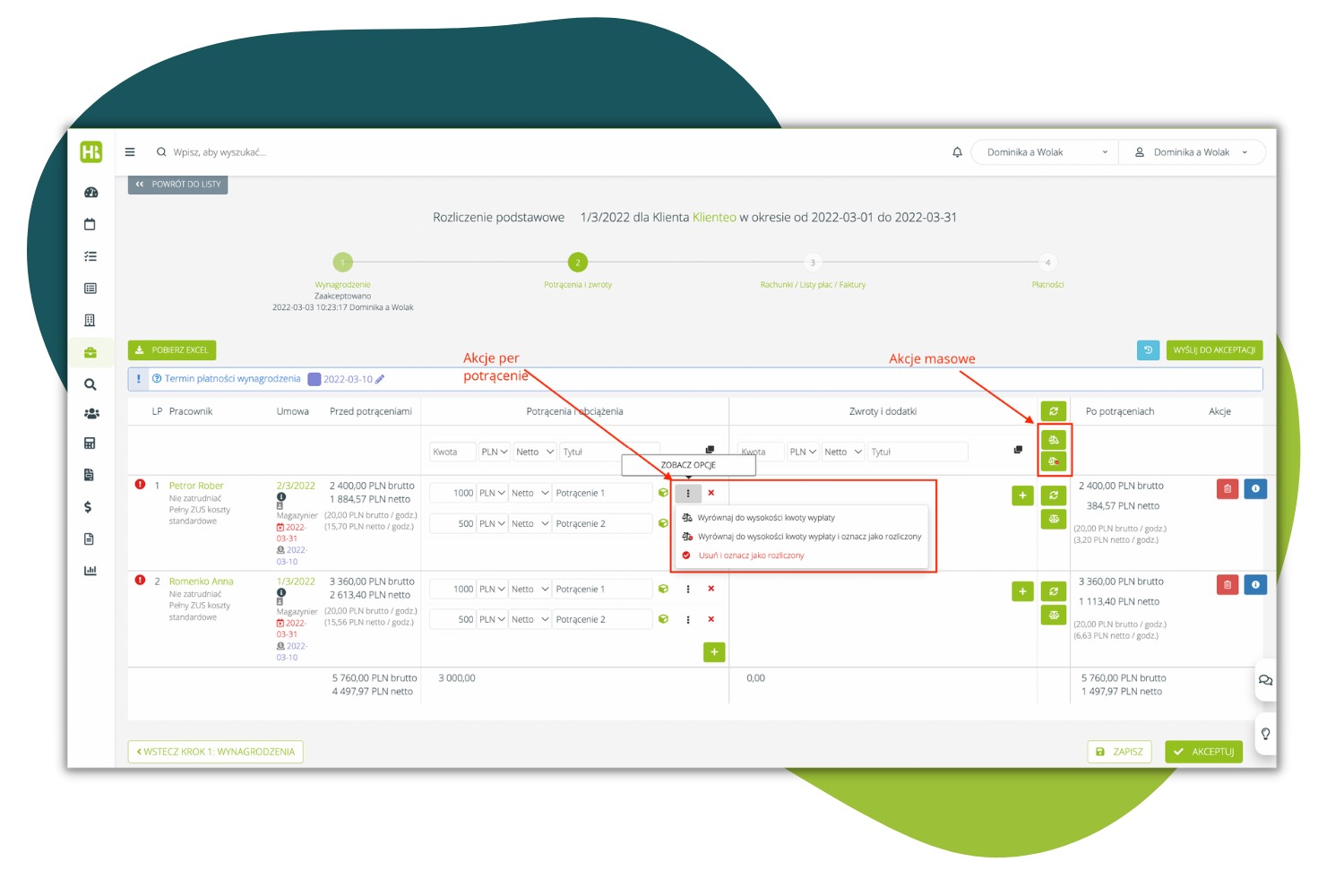 - masową opcję “Zmniejsz potrącenia do wysokości kwoty do wypłaty i oznacz przedmioty pomniejszone jako rozliczone„. Jeżeli potrącenia przekraczają kwotę netto dla pracownika, zostaną zmniejszone tak, aby kwota wypłaty wyniosła 0. Przedmioty zostaną oznaczone jako rozliczone i nie pojawią się w przyszłości do potrącenia (różnica nie potrącona zostanie zapomniana).”