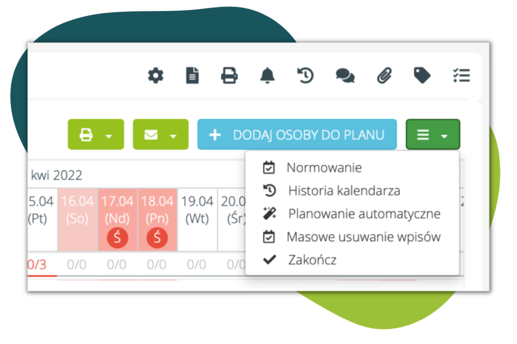 - Dodany został również nowy przycisk ze skumulowanymi opcjami: normowanie, historia kalendarza, planowanie automatyczne, masowe usuwanie wpisów