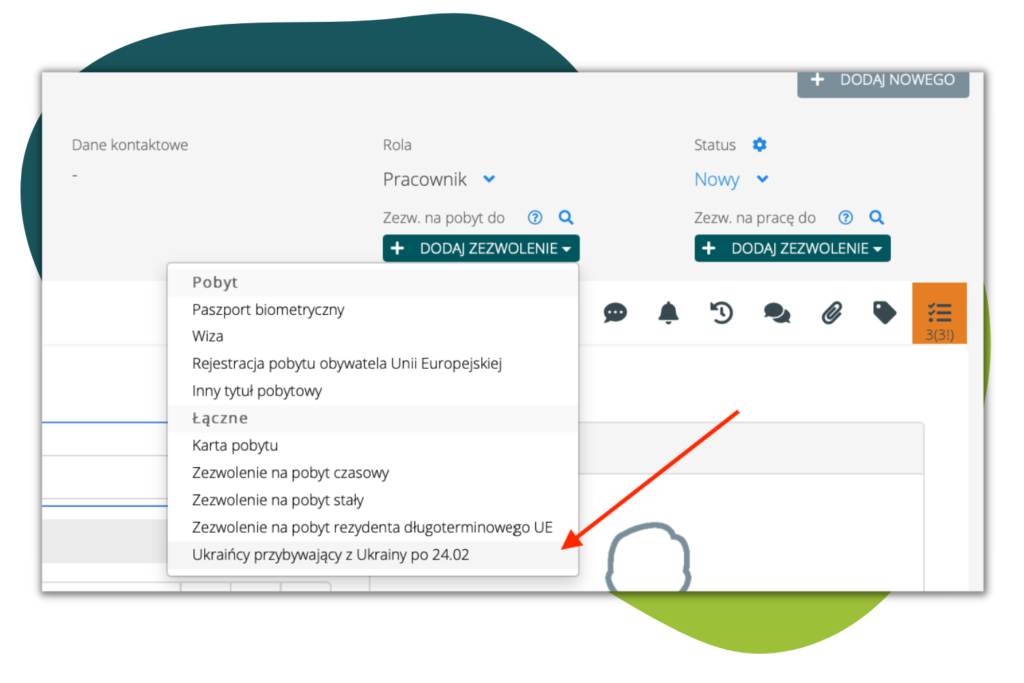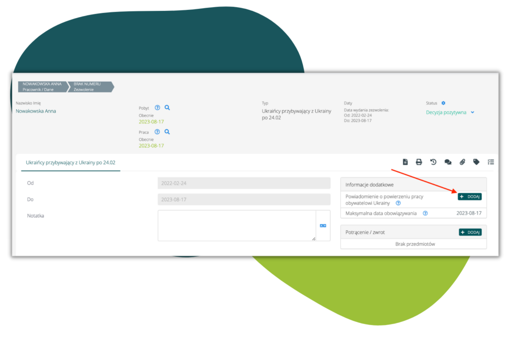 - Na potrzeby systemowe (w celu uzyskania informacji, które osoby mogą skorzystać z warunków specustawy) dodaliśmy zezwolenie „Ukraińcy przybywający z Ukrainy po 24.02.2022” . Dodawane jest, jeżeli obywatel Ukrainy przekroczył granicę bezpośrednio z Ukrainy po 24 lutym 2022 – jego pobyt jest przedłużany na okres 18 miesięcy, które liczone będą od daty 24.02.2022 i na tej podstawie dostaje możliwość zatrudnienia bez wnioskowania o zezwolenia na pracę lub oświadczenia.