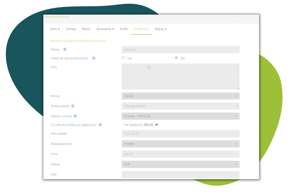W Pracownicy > Lista pracowników > Dany pracownik > Przedmioty > Dany przedmiot, zablokowana została możliwość edytowania zaliczki już zapłaconej. Po wybraniu przedmiotu zobaczymy informacje na szarym tle, bez możliwości zmian: