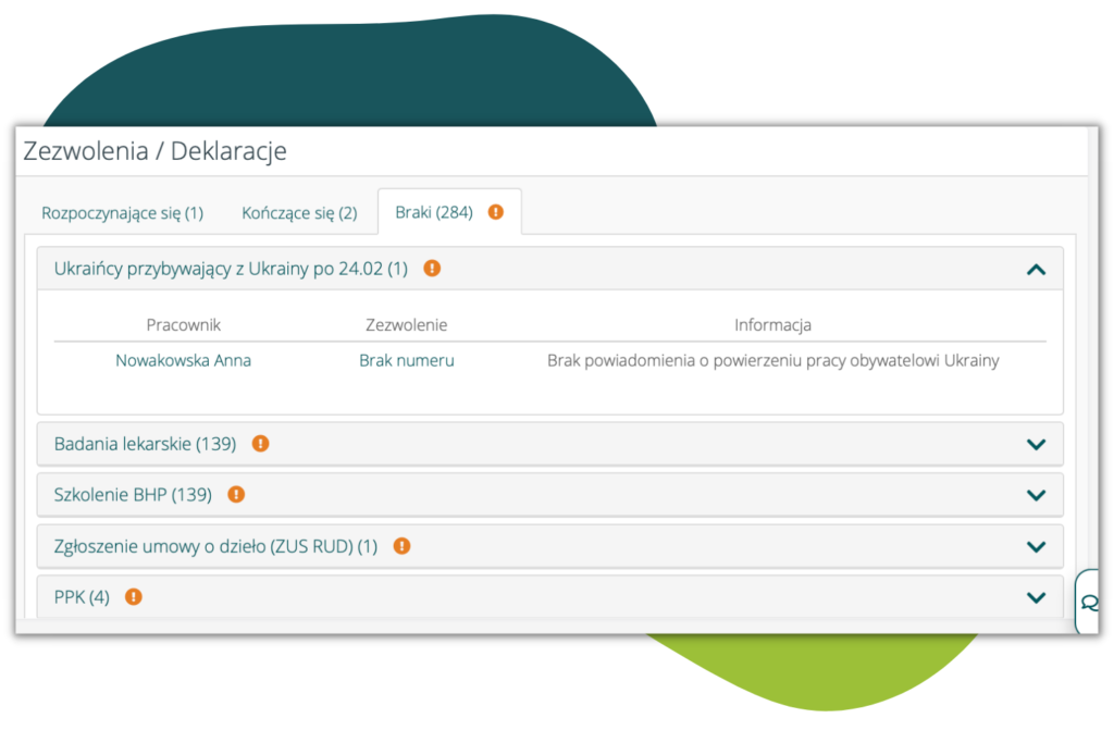 - Na dashboardzie w widgecie zezwoleń listowane są osoby, które posiadają zezwolenie „Ukraińcy przebywający z Ukrainy po 24.02.2022” oraz umowę, ale nie posiadają „Powiadomienia o powierzeniu wykonywania pracy obywatelowi Ukrainy zgodnie ze specustawą” – w terminie 14 dni od rozpoczęcia pracy
