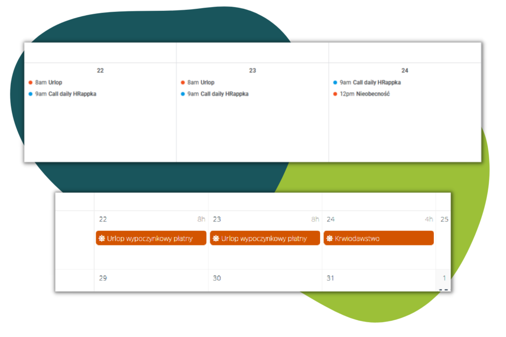 W przypadku integracji z Kalendarzem Google (tu przeczytasz jak ją utworzyć), nieobecności z Kalendarza w systemie HRappka automatycznie będą przenoszone do Kalendarza Google. Nieobecności, które w nazwie mają słowo „urlop”, będą przenoszone do kalendarza jako „urlop”, pozostałe opisane zostaną jako „nieobecność”.