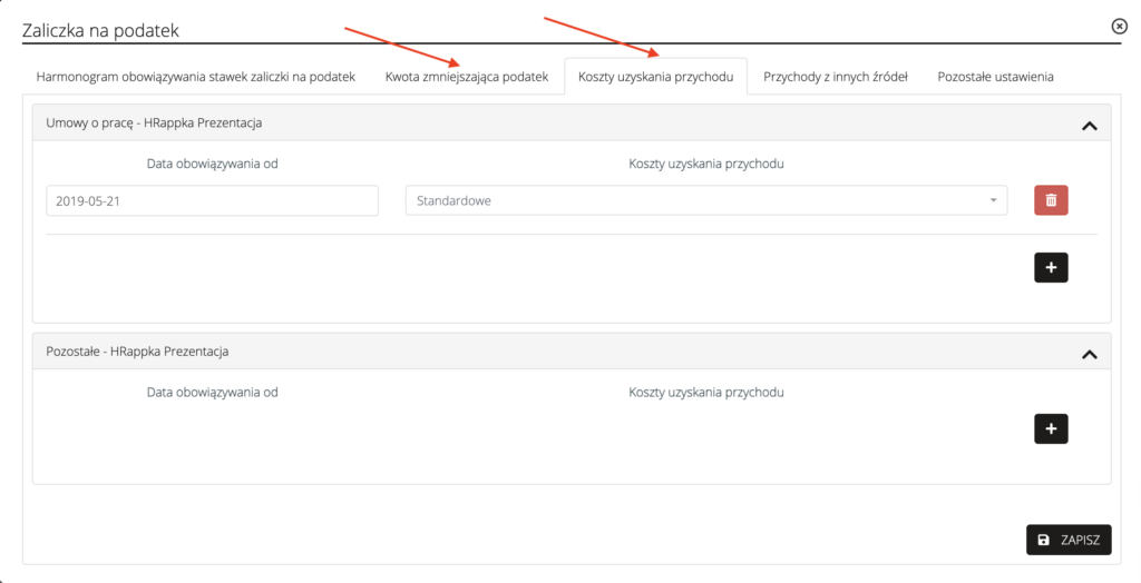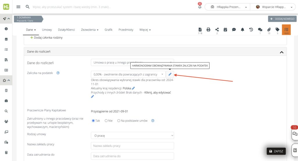 Ustawienia dot. kwoty zmniejszającej podatek i kosztów uzyskania przychodu zostały przeniesione z ustawień danych do rozliczeń na umowach do profilu pracownika do sekcji Dane do rozliczeń, po kliknięciu w ikonę ołówka w polu Zaliczka na podatek: