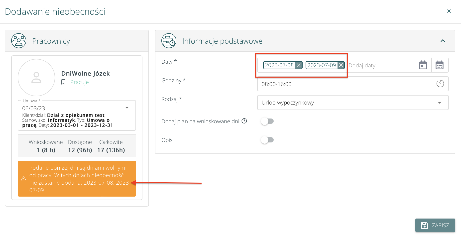 • Jeżeli wszystkie z wnioskowanych dni są dniami wolnymi – nie ma możliwości zapisania.