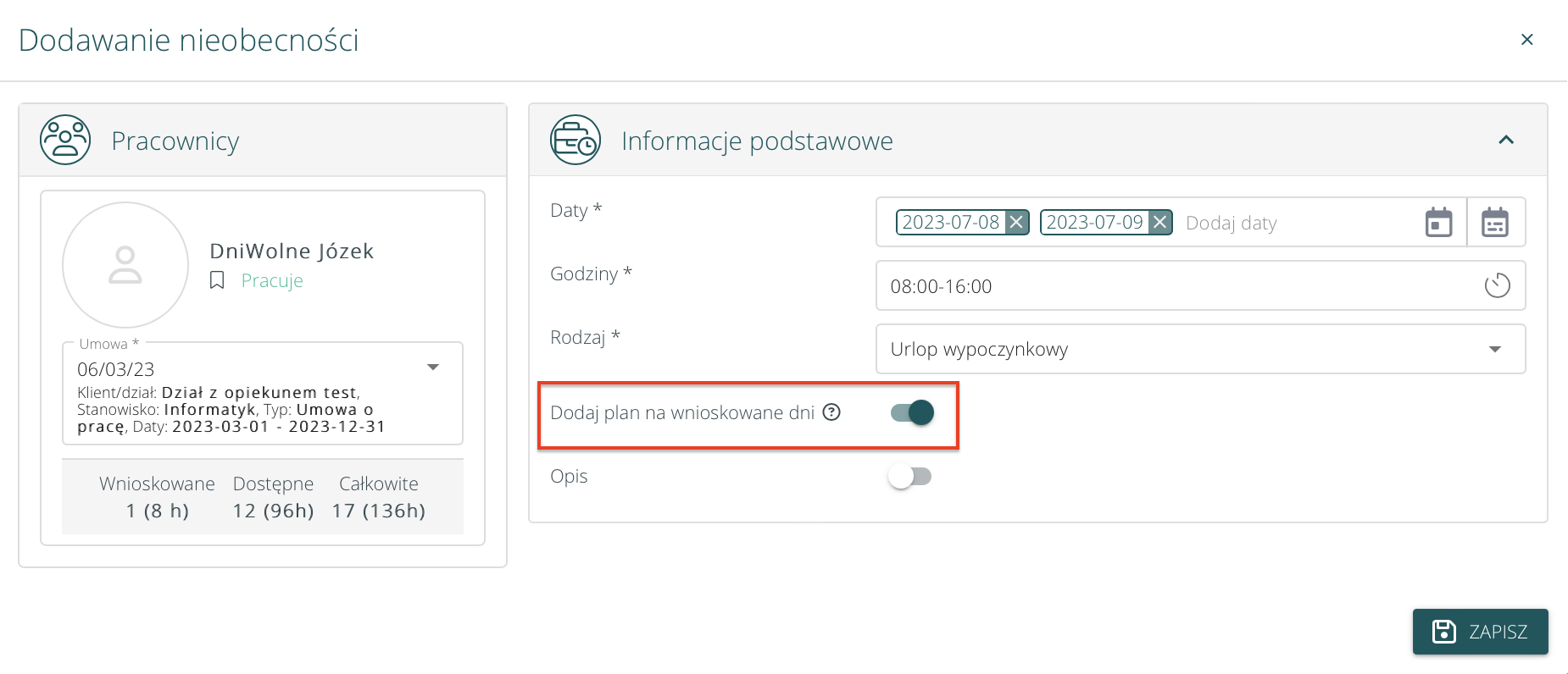 • Jeżeli użytkownik/administrator chce dodać nieobecności na dni wynikające z planu, ma możliwość zaznaczenia takiej opcji. Automatycznie wskazane dni nie będą dniami wolnymi. System w jednym momencie przyjmie plan i odrzuci go – dodając w tym dniu/dniach nieobecność.