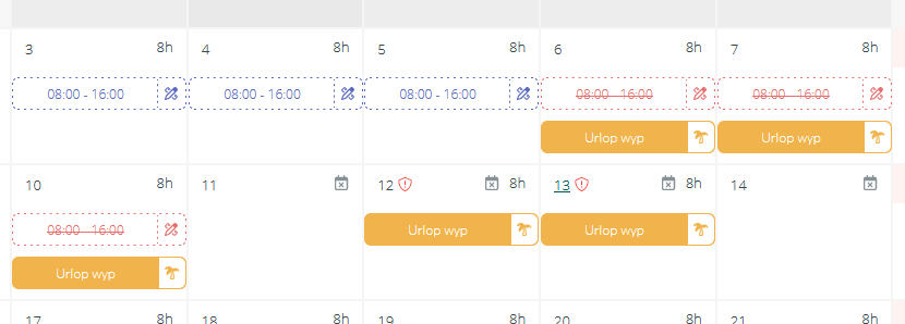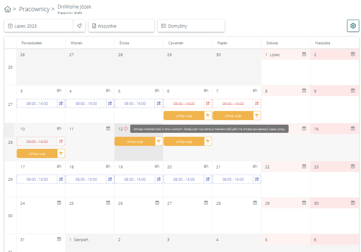 W przypadku ustawienia pilnowania normy czasu pracy z planu (nie ustawowej), gdy pracownicy zgłosili dni wolne na miesiąc, w którym nie został jeszcze zaplanowany czas pracy, a następnie użytkownik/administrator rozpocznie planowanie czasu pracy w tym miesiącu, system pokaże ostrzeżenie przy dodanych nieobecnościach, aby pamiętać o dodaniu planu także w te dni: