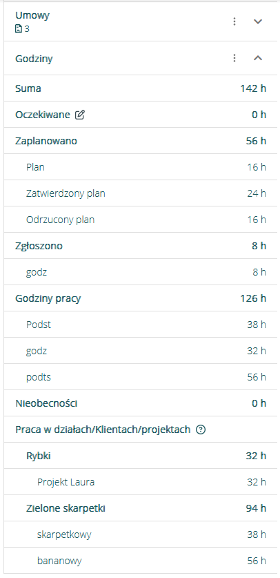 W przypadku, gdy na grafiku pracownika (Pracownicy > Lista pracowników > Dany pracownik > Grafik)  dodane zostaną wpisy na więcej niż jednego Klienta/Dział/Projekt, na podsumowaniu godzin pojawi się sekcja z wyszczególnionymi godzinami pracy dla każdego z obszarów: