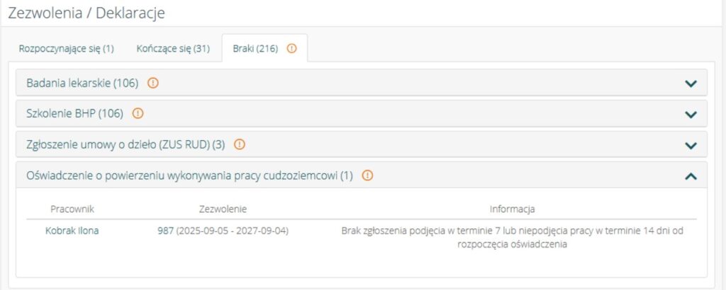 - Dashboard zezwoleń/deklaracji – w zakładce „Braki” dodano informację o datach ważności dokumentów (od/do).