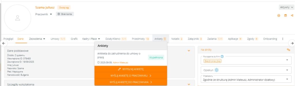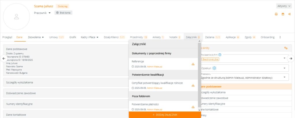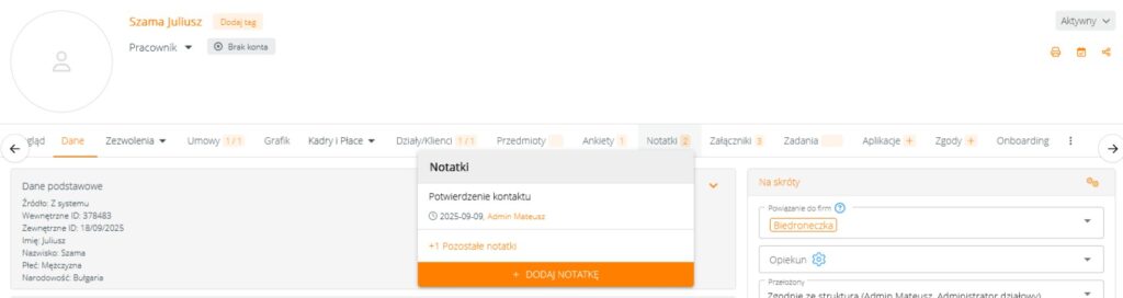 Na profilu pracownika oraz kandydata pojawił się panel szybkich skrótów. Od teraz można dodawać i przeglądać notatki, załączniki czy ankiety bez konieczności wchodzenia w dedykowaną zakładkę. Na każdej zakładce dostępne są liczniki wskazujące liczbę elementów. Panel szybkich skrótów obejmuje m.in.: