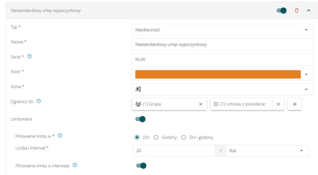W Ustawienia > Moduły > Pracownicy > Własne rodzaje nieobecności dodano nową opcję pod polem „Liczba i interwał”: Pilnowanie limitu w interwale.
