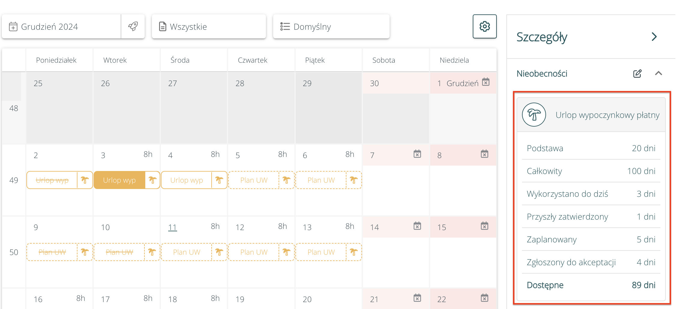 Co więcej, na grafiku pracownika, w sekcji Nieobecności po prawej, zwiększyliśmy ilość informacji o urlopie o: