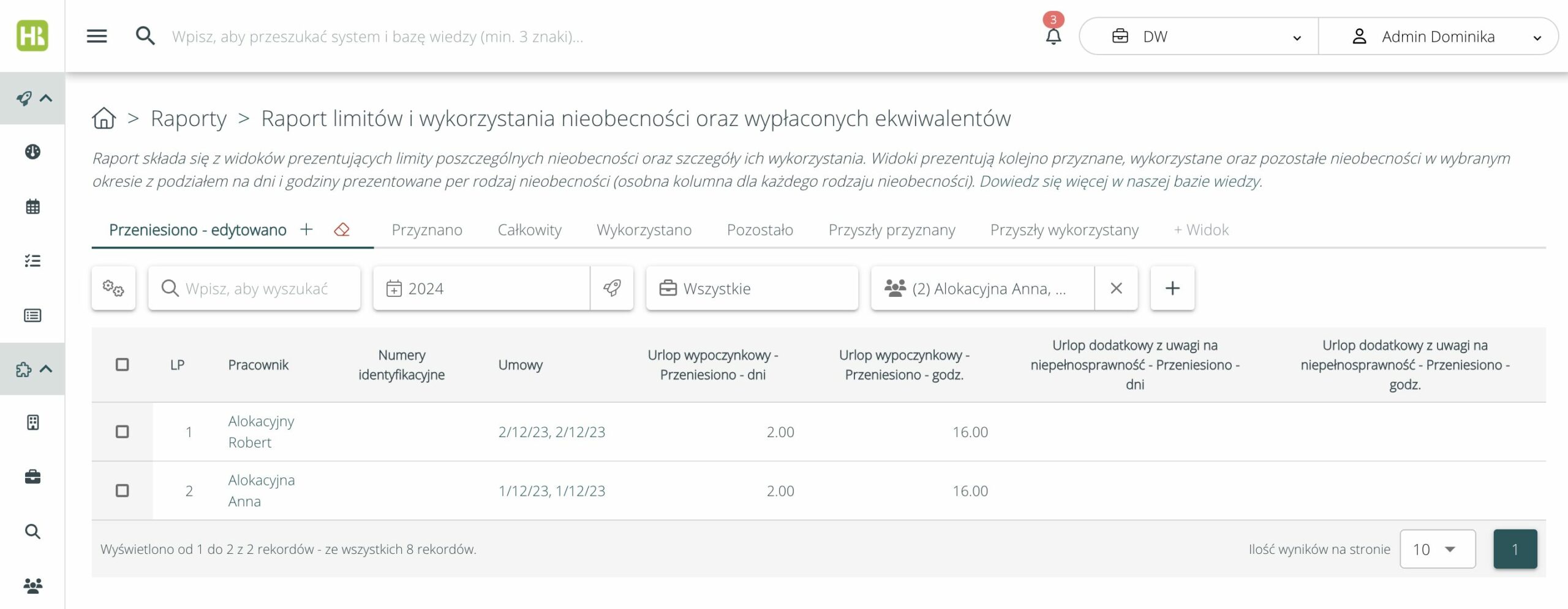 Więcej informacji na temat raportu dostępne jest na https://pomoc.hrappka.pl/baza-wiedzy/raport-limitow-nieobecnosci-i-ekwiwalentow/.