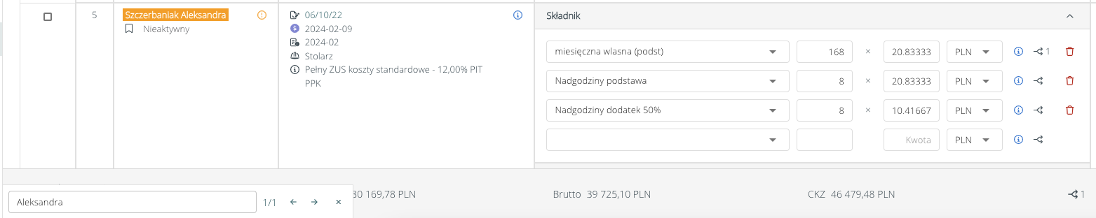 Po włączeniu wyszukiwarki rekordów (CTRL + F) na rozliczeniu działu / Klienta / projektu i wpisaniu wyszukiwanej frazy (w lewym dolnym rogu) wyświetlona zostanie informacja z liczbą pasujących rekordów. Na liście zostaną podświetlone wszystkie znalezione wartości, a na ekranie wyświetlona pierwsza pasująca wartość.