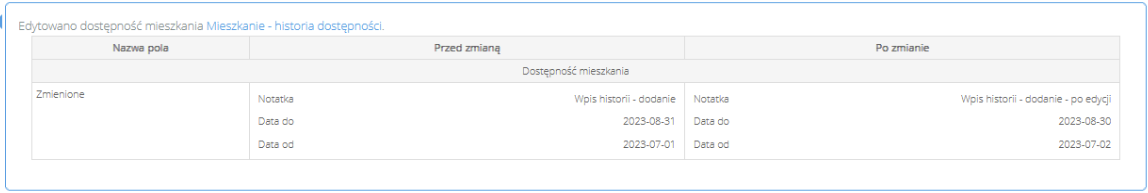 Podczas dodawania / edytowania / usuwania dostępności na wybranym mieszkaniu system zapisze tę informację i umożliwi wyświetlenie w historii wpisów. Nowa tabela przedstawi informacje na temat wykonanej czynności, a także wartości przed zmianą i po zmianie.