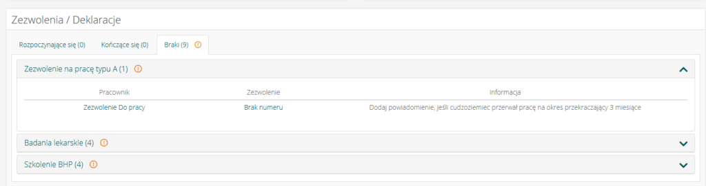 Na głównym dashboardzie w widgetcie Zezwolenia / Deklaracje dodaliśmy nowy komunikat informujący o przerwaniu pracy przez cudzoziemca. Zostanie on wyświetlony w dwóch przypadkach: