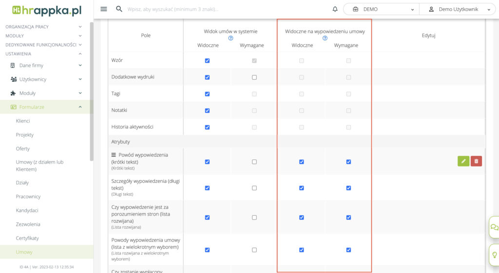 Nowe atrybuty, które powinny być widoczne na formularzu wypowiedzenia należy skonfigurować w Ustawieniach > Formularze > Umowy w kolumnie „Widoczne na wypowiedzeniu umowy”: