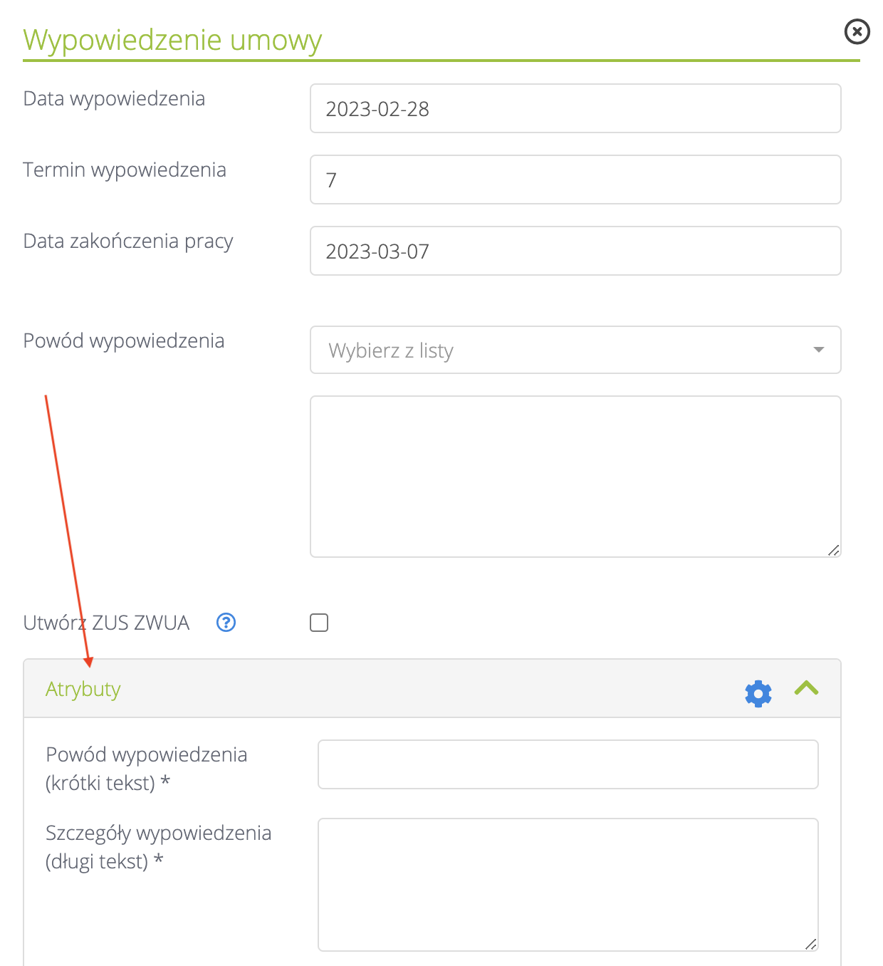 Włączone atrybuty będą widoczne / wymagane podczas dodawania wypowiedzenia pracownikowi: