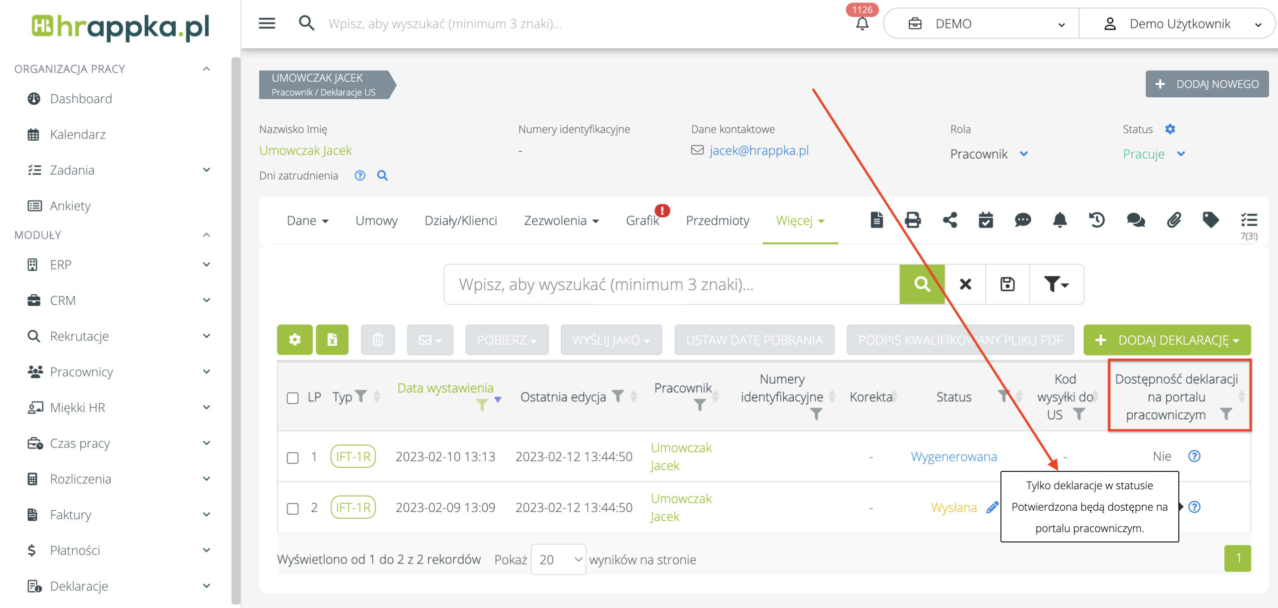 Weryfikacja dostępności deklaracji pracownika na portalu pracowniczym #