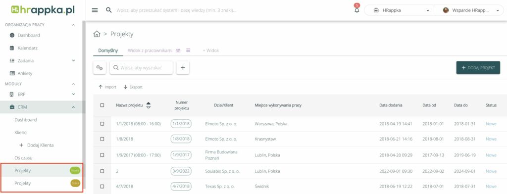 W CRM > Projekty dostępna jest nowa lista projektów, która jest bardziej przejrzysta oraz zawiera wygodniejsze filtry, ustawienie widoku kolumn oraz możliwość tworzenia widoków (zapisanych filtrów i kolumn).