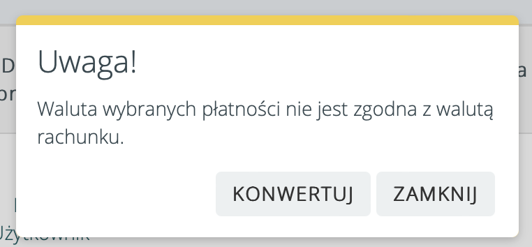 Jeżeli w Płatności > Zobowiązania, z listy zobowiązań wybrana zostanie opcja “Generuj paczki przelewów”, płatność jest np. w PLN, a rachunek bankowy (firmowy, z którego wychodzi przelew) np. w EUR, to pokazany zostanie komunikat: