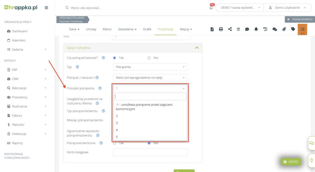 Umożliwiliśmy zarządzanie kolejnością potrąceń w rozliczeniach poprzez dodanie do przedmiotów pola „Priorytet potrącenia” (Pracownicy > Lista pracowników > Dany pracownik > Przedmioty).