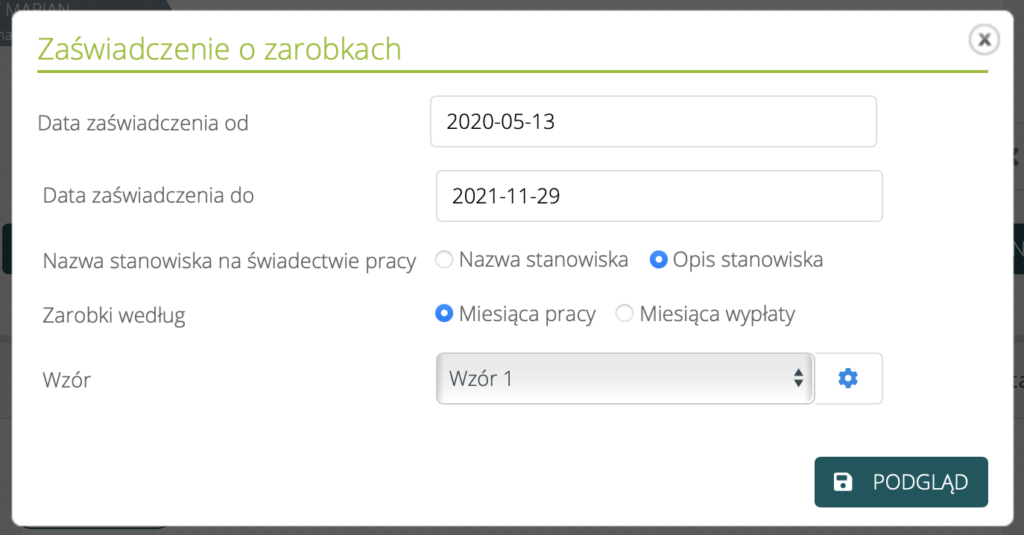 W Ustawienia firmy > Szablony > Wydruki > Zaświadczenie o zarobkach dodane zostały nowe znaczniki:- {%Data od umowy%} – najwcześniejsza data rozpoczęcia pracy z umów pobranych do zaświadczenia