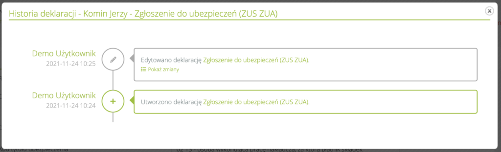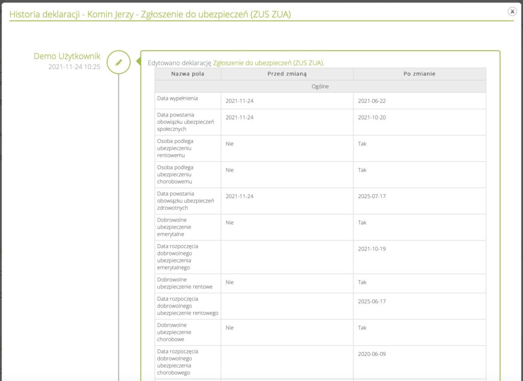 Jeżeli paszport jest wymagany (włączona jest opcja „wymagane” w ustawieniach formularzy pracowników), to wymagane jest również wypełnienie pola “data ważności paszportu”.Dodanie historii Deklaracji ZUS #