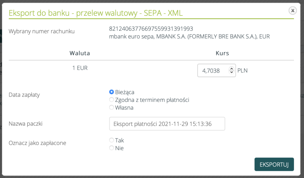 - Po eksporcie na płatności xml znajduje się kwota w EUR (lub innej walucie)