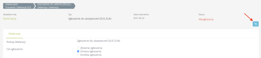 W Pracownik > Więcej > Deklaracje ZUS dodana została historia edycji deklaracji – dotyczy to ZUA, ZZA, ZWUA, ZCNA, ZIUA. Po wejściu na deklaracje należy kliknąć w niebieską ikonkę po prawej stronie: