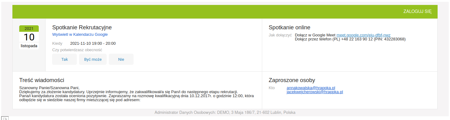 - Po zapisaniu spotkania, zaproszeni uczestnicy dostają powiadomienie na podanego maila. W przypadku aktywnej integracji z Google spotkanie zostanie automatycznie dodane w Google Calendar.