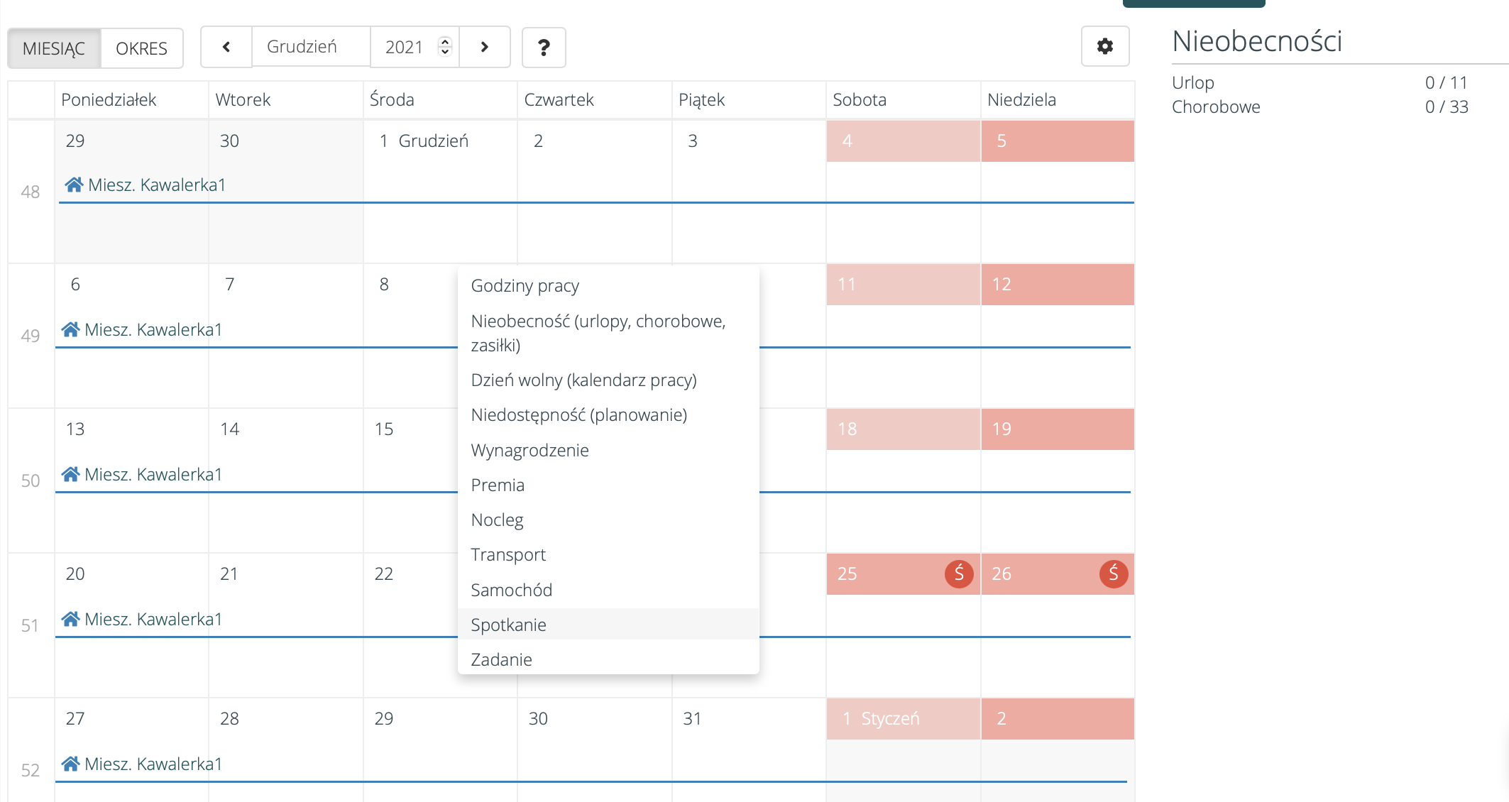 Spotkania można dodawać w Organizacja pracy > Kalendarz oraz na kalendarzach obiektów w systemie (np. kandydatów, pracowników, Klientów). Na kalendarzu podczas tworzenia spotkań została również dodana możliwość tworzenia spotkań online.