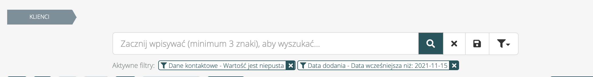 - W obrębie jednego pola filtr działa na zasadzie “lub”. Na przykład, po wpisaniu w „Opiekun Klienta” – Nowak Anna, Kowalska Elżbieta – filtr znajdzie Klientów, którzy mają ustawione obie te osoby lub jedną z nich.