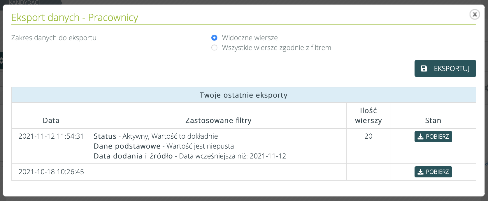 - Export danych: dodanie informacji o widocznych i zaznaczonych wierszach.